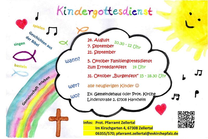 Unser Kindergottesdienst findet im Ev. Gemeindehaus in Harxheim statt. Kommt vorbei, wir freuen uns auf euch.
